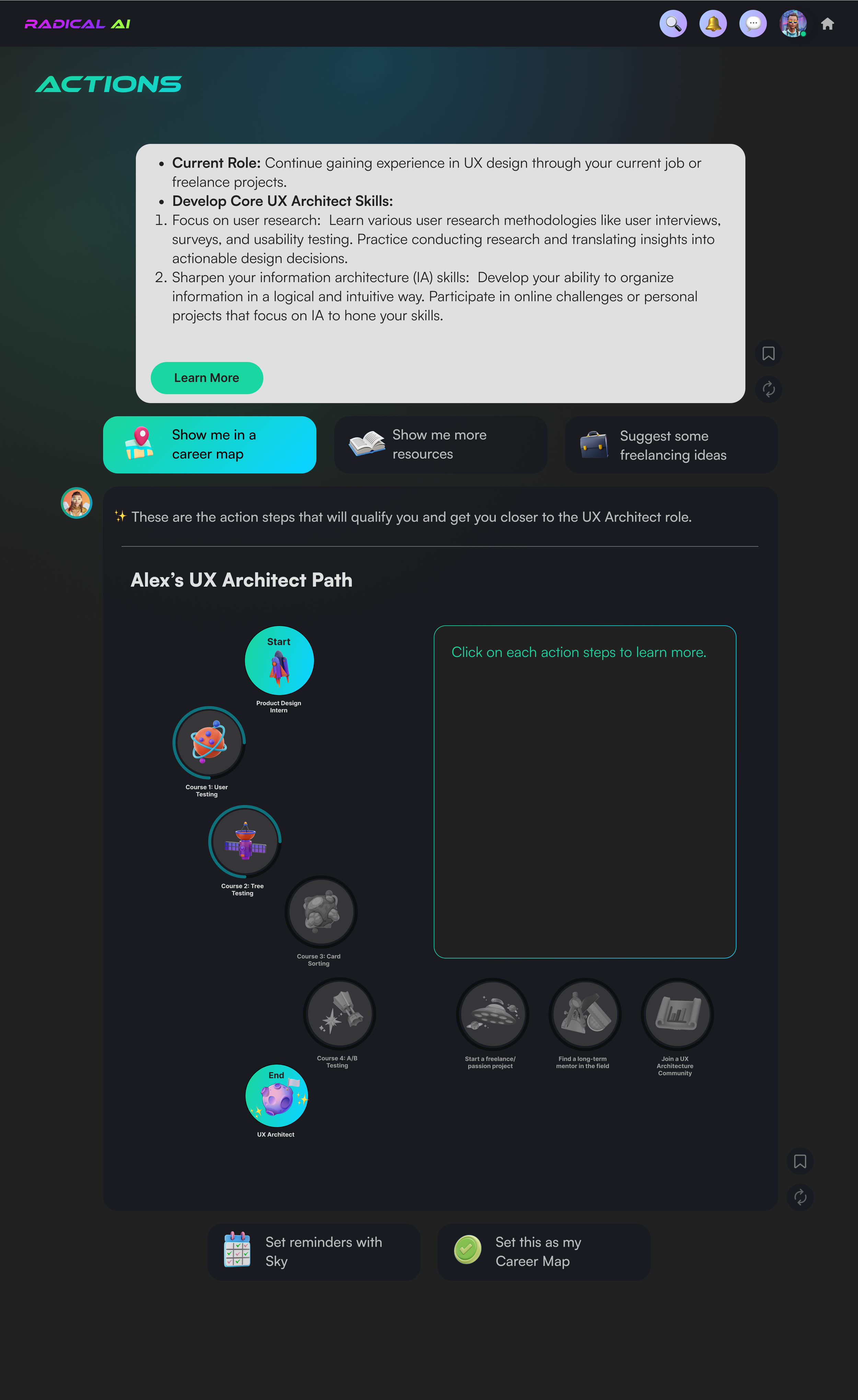 Personalized AI Career Journeys: Design interactive career paths to guide users through AI career stages, aligned with Radical AI’s mission.